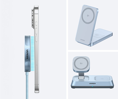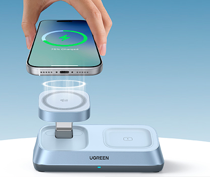 — Компактное беспроводное зарядное устройство UGREEN W756 со складной конструкцией и регулируемым углом наклона.